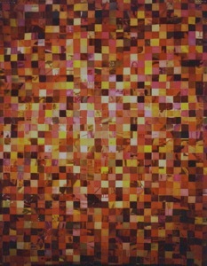 pair of paper grids, each approximately 5 ft. x 6 ft., constructed from squares cut from magazine pages, each of which is a solid color on one side and has random bits of text and imagery on the reverse side, which is revealed with backlighting