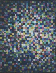 pair of paper grids, each approximately 5 ft. x 6 ft., constructed from squares cut from magazine pages, each of which is a solid color on one side and has random bits of text and imagery on the reverse side, which is revealed with backlighting