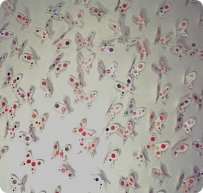 I was using my time at MacDowell to work simultaneously on two disparate and seemingly unconnected pieces. My work revolved around not only books at the time, but about other forms of print media as well - magazines, in particular - and the two projects I was working on at the time were my Moby Dick book piece, a giant eleven foot text spiral constructed from two copies of the Melville classic, and an installation of white paper butterflies embellished with polka-dots cut from brightly colored images of makeup in fashion and beauty magazines. The two pieces could not have seemed more disconnected to me at the time - Moby Dick being the hyper-masculine tale that it is, and then this girly butterfly piece conjured from memories of being a teenager just beginning to wear makeup and rather over-doing it, gobbing great quantities of color onto my young, unblemished skin. As time- and labor-intensive as the large book pieces are, I tend naturally not to read closely (or at all) the text as I'm working on it, except to make sure I'm on track. One particular day in my studio there, though, the word butterfly just happened to catch my eye as I laid down a line of text from Moby Dick, and I couldn't help but stop and read the passage in which it appeared. It was a part of the chapter entitled 'The Whiteness of the Whale', an eight-or-so page musing on the psychology and symbolism of the color white. Here is what I read: