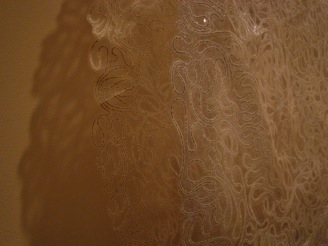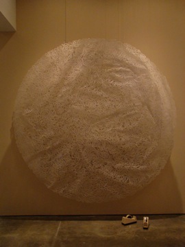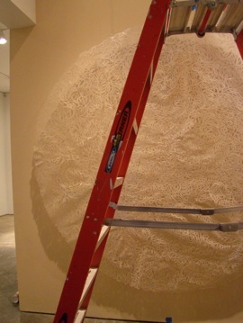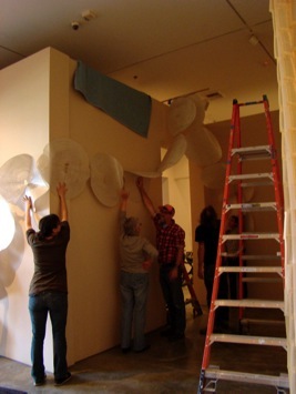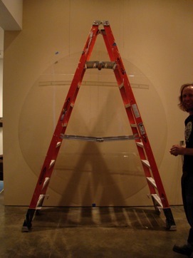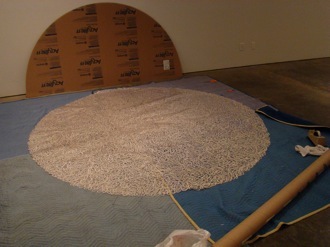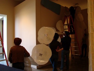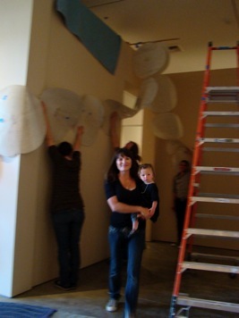 I spent last Thursday and Friday at the Long Beach Museum of Art, working on the installation of the two pieces of mine (the Odyssey and Metamorphoses pieces) that are included in the show there that opens this weekend.  The staff there are fantastic - so friendly and funny and easy to deal with, and great at what they do, with all kinds of musical and artistic talents outside of their work there too.  They had a kooky wild idea for the installation of the 30-plus foot long Metamorphoses piece that I haven’t even yet seen, as we hadn’t gotten that far, even after two days of installation.  I can’t wait to see how it turned out!  The piece that did get put up, “Sing in me Muse, and help me tell the story.....” (The Odyssey) looks great.  Really really great.  I am so pleased.  I was underwhelmed with how it looked in the Encinitas Library show, and so I did some re-thinking and re-working, some brainstorming with both Xavier (my husband) and with Brooks, the preparator at LBMA, and finally forked out some $600 to Ridout Plastics (in San Diego - expensive, but great, great service!!!) to have two 8-foot diameter plexi circles cut to back the piece.  It made a world of difference and I am really glad to have made the change.  Because of the giant plexi pieces, I had to rent a giant truck to get the pieces to the museum, a fact which will probably amuse anyone who knows me well, as I hate - HATE - to drive.  Anyway, here are some photos from the big days!  Thank you, by the way, to Xavier for taking a day off to keep the kiddos the first day , to my son Hugo’s awesome preschool for letting him hang out a bit later than normal on the second day, and to my friend Rebecca for helping out by watching little miss Esmé the second day.  It takes a village!