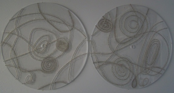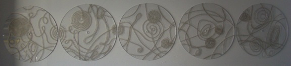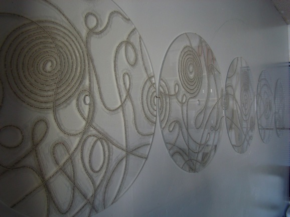 The images above and below are from the first piece in this new exploration, entitled ‘arches, loops & whorls’. It is a five-part drawing on plexi discs about 20 inches across each, the lines of the drawing created from lines of text cut from passages from short stories by my favorite writer, Haruki Murakami.