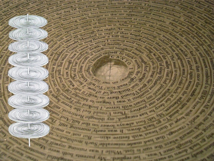 Dante’s Inferno, cut apart line by line and assembled in readable order with clear tape onto a series of nine plexi circles approximately 20 inches in diameter and mounted onto a floor-to-ceiling height clear plexi road going through the centers of the discs.