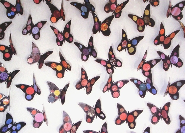 installation of approximately 200 paper butterflies constructed from white paper cut from magazine pages and embellished with polka-dots cut from images of cosmetics - also from magazine pages. the butterflies are two layers thick, hand-sewn, laminated and pinned to the wall. the title comes from the chapter entitled “the whiteness of the whale” in moby dick.