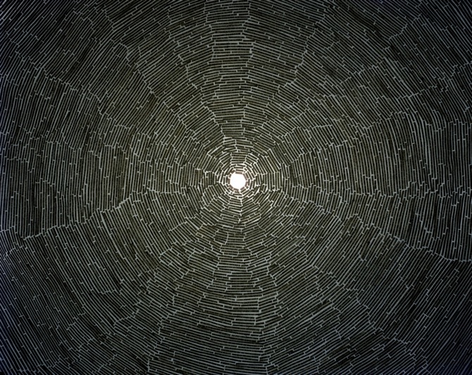 this photograph was made of an installation of the moby dick piece, constructed by taking two copies of the book, cutting it apart line by line and assembling it with clear tape into a spiral - starting with “call me ishmael” in the center, and reading outwards from there - eleven feet in diameter.