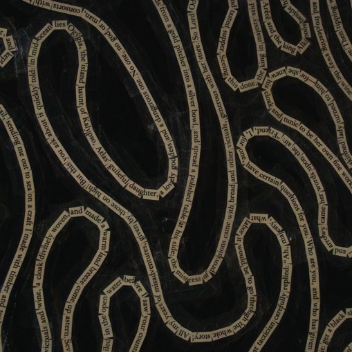 two copies of the book The Odyssey cut apart line by line (even word by word / letter by letter in places...) and assembled in readable order with tape onto clear mylar in a meandering line that forms two circles, each eight feet in diameter and hanging one in front of the other