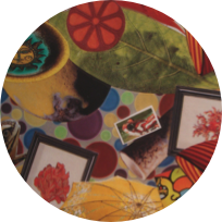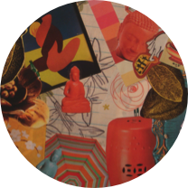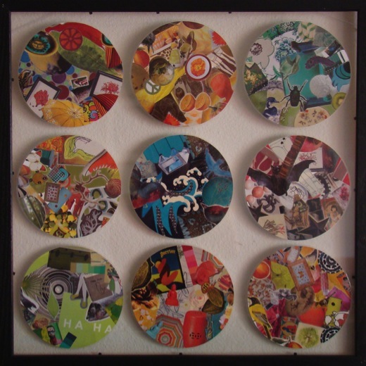 grid of nine six-inch collages, made from images cut from magazine pages on bristol & laminated