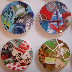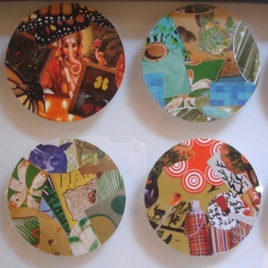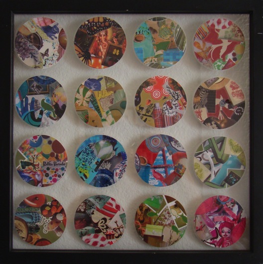 grid of sixteen three-inch collages, made from images cut from magazine pages on bristol & laminated