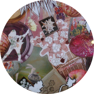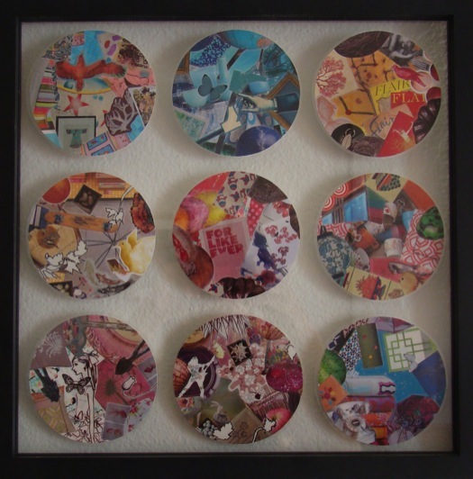 grid of nine six-inch collages, made from images cut from magazine pages on bristol & laminated