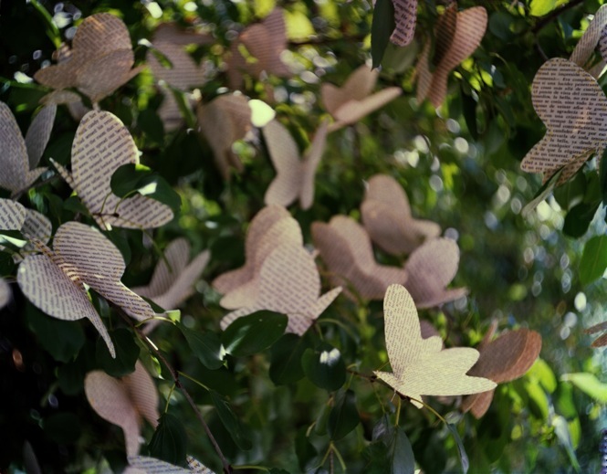 photograph made from an installation of paper butterflies cut and hand-sewn from the pages of Gabriel Garcia Marquez’s One Hundred Years of Solitude pinned to the branches of a tree.