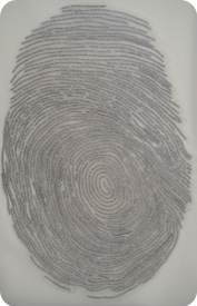 In creating the piece, your thumbprint is enlarged to approximately 22” x 33” in size and used as the pattern for laying down the text selected for your piece with acid-free clear tape onto vellum and then matted and framed in a 27” x 40” frame.