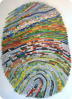 Create a very personalized portrait using the patterns of your own thumbprint and texts that have special meaning for you (favorite books, poetry, song lyrics, movies, quotes, blog posts, wedding vows, etc. etc. A great gift for artlovers, booklovers, parents, poets, authors, songwriters, bloggers world travelers and others.