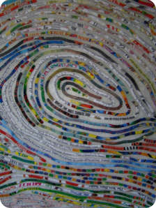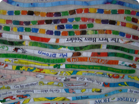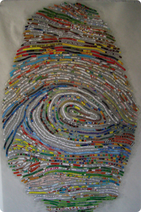 All that is needed for this portrait is a list of 15-20 of your favorite books! Other options could include using your children’s favorite books (and their thumbprints), even a list of favorite films, and using dissembled movie posters, song lyrics, cut from the liner notes of favorite cd’s, images and titles from cd or album covers, postcards/travel books/maps for the avid traveler.......). The possibilities are endless! This one is a portrait of my cousin Sheila’s young son Carver, who has a great collection of books!