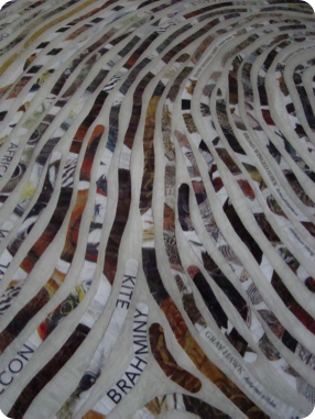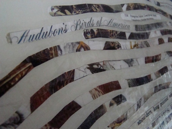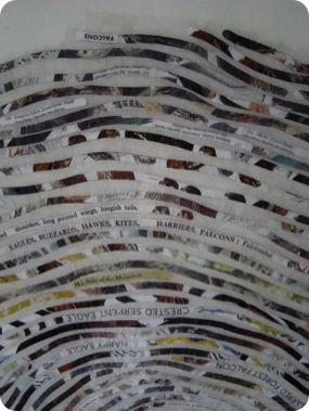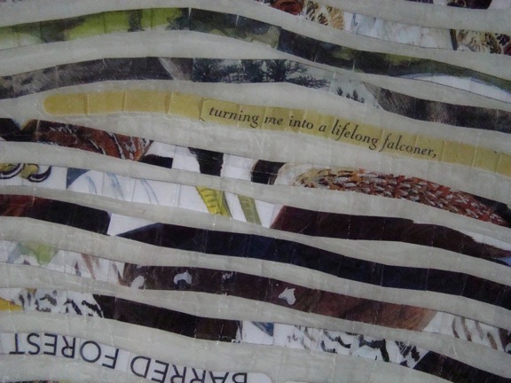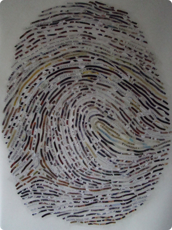All that is needed for this portrait is a list of 15-20 of your favorite books! Other options could include using your children’s favorite books (and their thumbprints), even a list of favorite films, and using dissembled movie posters, song lyrics, cut from the liner notes of favorite cd’s, images and titles from cd or album covers, postcards/travel books/maps for the avid traveler.......). The possibilities are endless! This one is a portrait of Cal, a 14-year-old accomplished falconer, and his thumbprint portrait is made up entirely of bits of text and imagery from books about falcons, hawks, owls and the like. His passion made for a gorgeous direct-from-nature color scheme that I really enjoy.