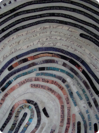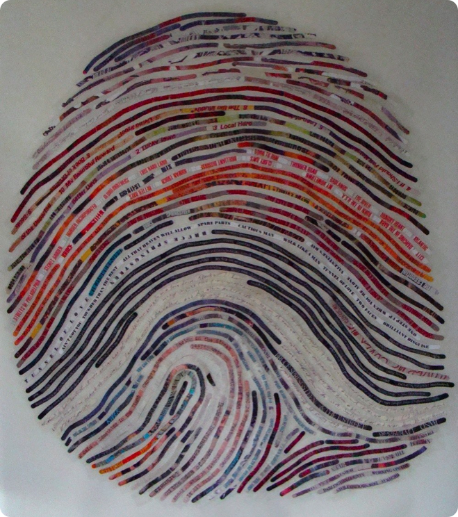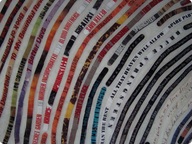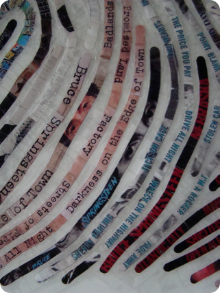 All that is needed for this portrait is a list of 15-20 of your favorite books! Other options could include using your children’s favorite books (and their thumbprints), even a list of favorite films, and using dissembled movie posters, song lyrics, cut from the liner notes of favorite cd’s, images and titles from cd or album covers, postcards/travel books/maps for the avid traveler.......). The possibilities are endless! This one is a portrait of Dan, father of six, who is a musician and a HUGE Bruce Springsteen fan, and his portrait is comprised of album covers and liner notes from ALL of Bruce Springsteen’s records! (at least as far as I know it’s all of them.........)