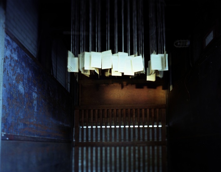 this photograph was made of an installation of book pages suspended from threads in a freight elevator in an abandoned mill in groton, massachusetts