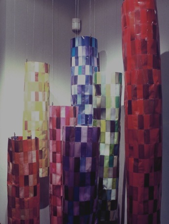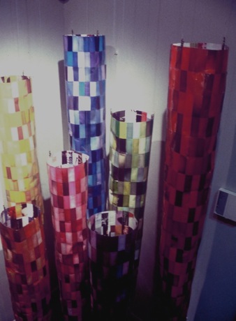 hanging columns ranging in length from approximately 3 feet to 7 feet, constructed from 1 inch x 3 inch rectangles cut from areas of solid color from magazine pages