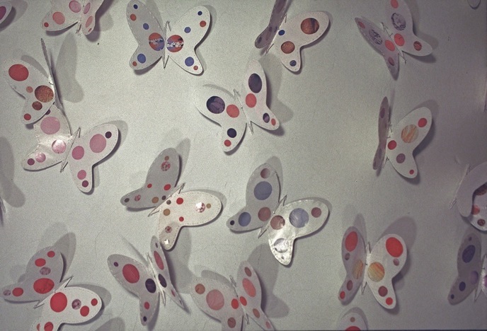 installation of approximately 200 paper butterflies constructed from white paper cut from magazine pages and embellished with polka-dots cut from images of cosmetics - also from magazine pages. the butterflies are two layers thick, hand-sewn, laminated and pinned to the wall. the title comes from the chapter entitled “the whiteness of the whale” in moby dick.