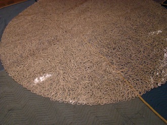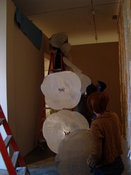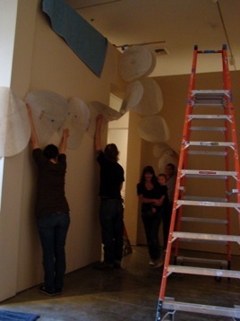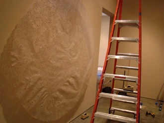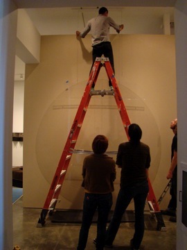 I spent last Thursday and Friday at the Long Beach Museum of Art, working on the installation of the two pieces of mine (the Odyssey and Metamorphoses pieces) that are included in the show there that opens this weekend. The staff there are fantastic - so friendly and funny and easy to deal with, and great at what they do, with all kinds of musical and artistic talents outside of their work there too. They had a kooky wild idea for the installation of the 30-plus foot long Metamorphoses piece that I haven’t even yet seen, as we hadn’t gotten that far, even after two days of installation. I can’t wait to see how it turned out! The piece that did get put up, “Sing in me Muse, and help me tell the story.....” (The Odyssey) looks great. Really really great. I am so pleased. I was underwhelmed with how it looked in the Encinitas Library show, and so I did some re-thinking and re-working, some brainstorming with both Xavier (my husband) and with Brooks, the preparator at LBMA, and finally forked out some $600 to Ridout Plastics (in San Diego - expensive, but great, great service!!!) to have two 8-foot diameter plexi circles cut to back the piece. It made a world of difference and I am really glad to have made the change. Because of the giant plexi pieces, I had to rent a giant truck to get the pieces to the museum, a fact which will probably amuse anyone who knows me well, as I hate - HATE - to drive. Anyway, here are some photos from the big days! Thank you, by the way, to Xavier for taking a day off to keep the kiddos the first day , to my son Hugo’s awesome preschool for letting him hang out a bit later than normal on the second day, and to my friend Rebecca for helping out by watching little miss Esmé the second day. It takes a village!