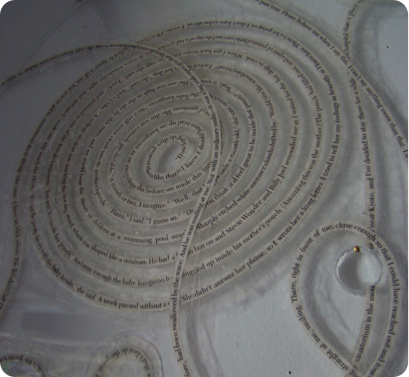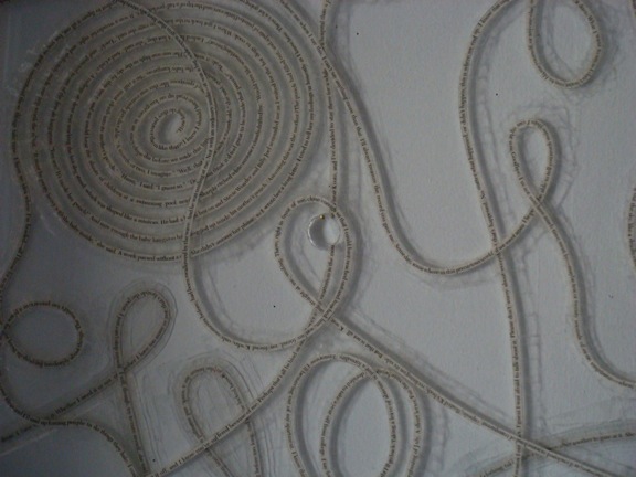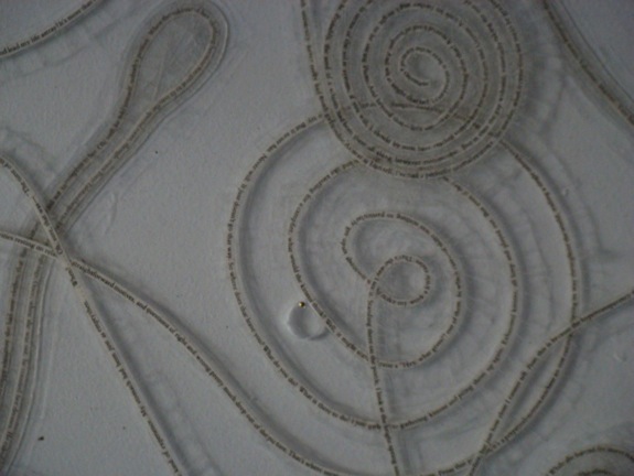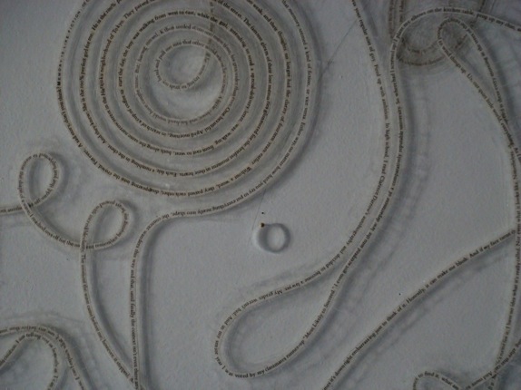 The images above and below are from the first piece in this new exploration, entitled ‘arches, loops & whorls’.  It is a five-part drawing on plexi discs about 20 inches across each, the lines of the drawing created from lines of text cut from passages from short stories by my favorite writer, Haruki Murakami.