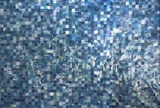 paper grid of varying size made from hundreds of 1 1/2” squares cut from images of waves from surfing magazines and put together with clear tape
