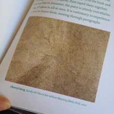 "The most impressive piece in this show of artists who incorporate literary texts into their works is an 11-foot circle by Cheryl Sorg, which upon close examination turns out to be "Moby-Dick" cut and pasted into a very long spiral."