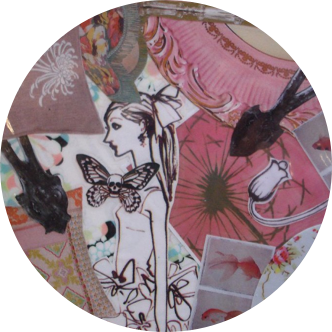 grid of nine six-inch collages, made from images cut from magazine pages on bristol & laminated
