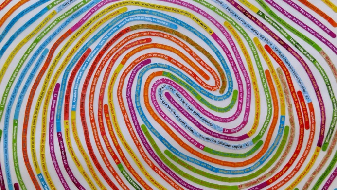 One of my new favorite things - collaborations with authors! I created this thumbprint portrait with Jennifer Gooch Hummer, author of the novel ‘Girl Unmoored’. It incorporates the headings (in Latin!) of each chapter, along with a selected snippet / passage from that chapter. It is wildly colorful, was incredibly fun to work on, and now - having read and re-read the snippets in the making of the piece - I am dying to read the book!