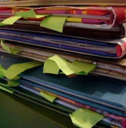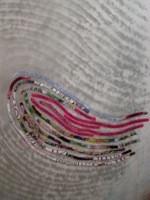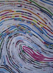 Then I had the selected thumbprint enlarged at Kinko’s to approximately 24” x 36” in size, hang it on my studio wall and overlay a translucent sheet of engineering vellum of the same size. The enlarged thumbprint printout will serve as my template as I lay down bits of color, image and text from color photocopies of Grace’s selected books onto the vellum, recreating the patterns of her print (above right image).