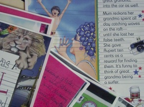 Once I had all of Grace’s books (most of which, luckily, her mom was able to bring to me, and then a couple of which I got from the library), I spent a chunk of time at Kinko’s (spending a LOT of time there these days.....I bribe the kids with fun coloring supplies and/or treats to keep them occupied while I do my thing) at the self-serve color copier copying the covers and pages of the books, enlarging here, reducing there, in order to get the most important parts to fit nicely into the 1/4-inch thick strips I later cut them into. Here are some images of the resulting copies, along with the lines marked for when I cut the strips.
